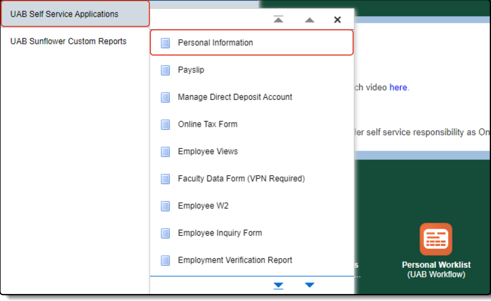 Select the Personal Information icon from the Oracle home page or open the hamburger menu at the top left of the page, click on UAB Self Service Applications, and select Personal Information.