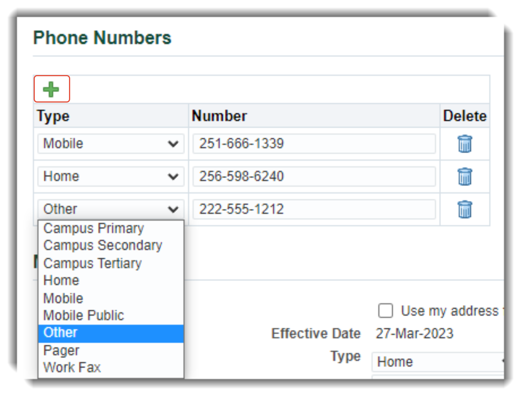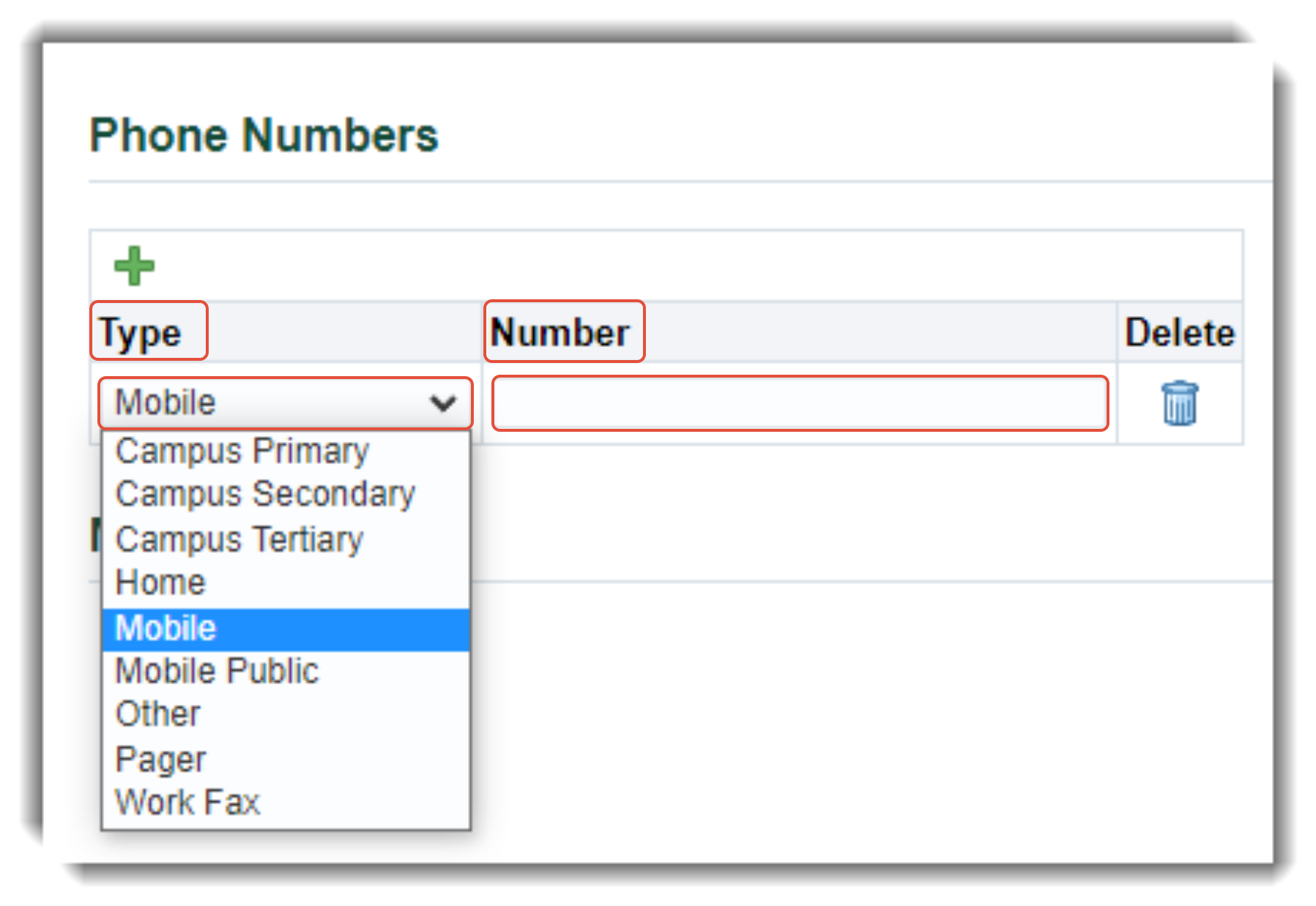 You can designate more than one person as an Emergency Contact, but only one Primary Contact.3. Phone numbers - Multiple phone numbers can be entered for an single contact. To enter the first number, select the phone Type using the drop-down list and enter the phone number in the Number field.