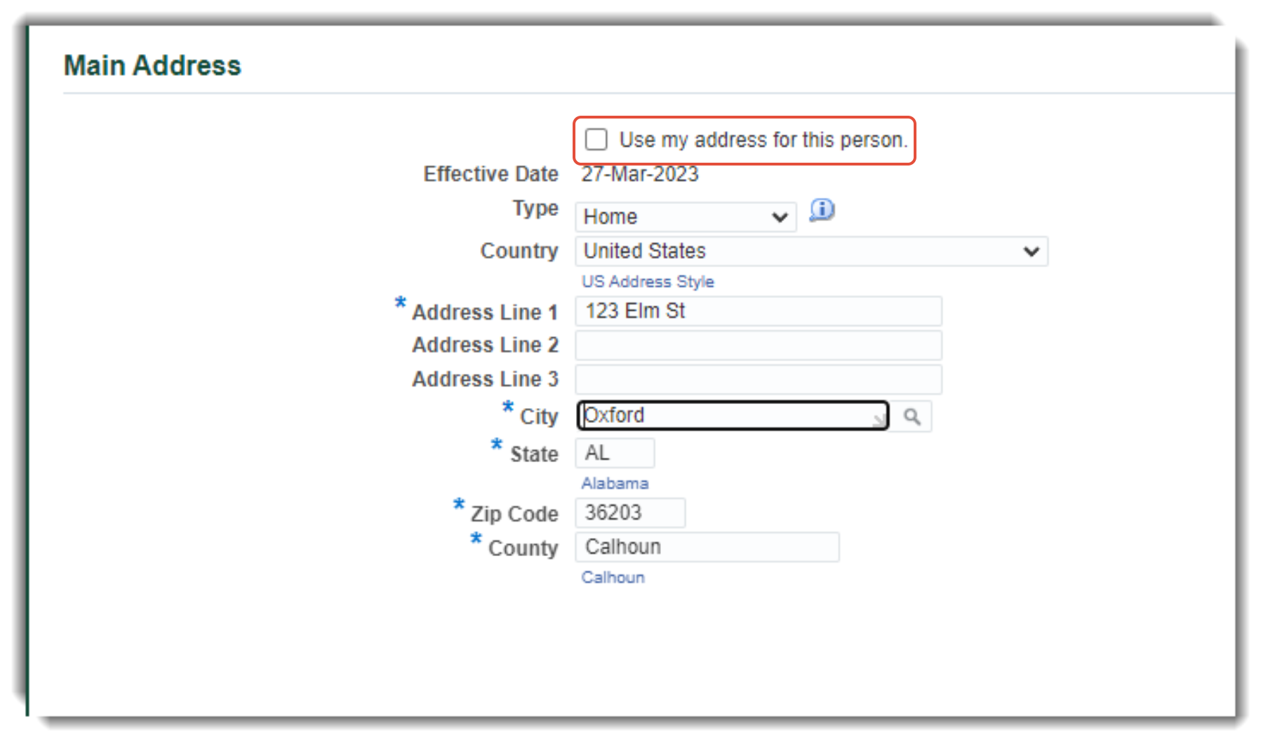 5. Main Address - Enter the Emergency Contact's address or select Use My Address for This Person to autofill the employee's address.