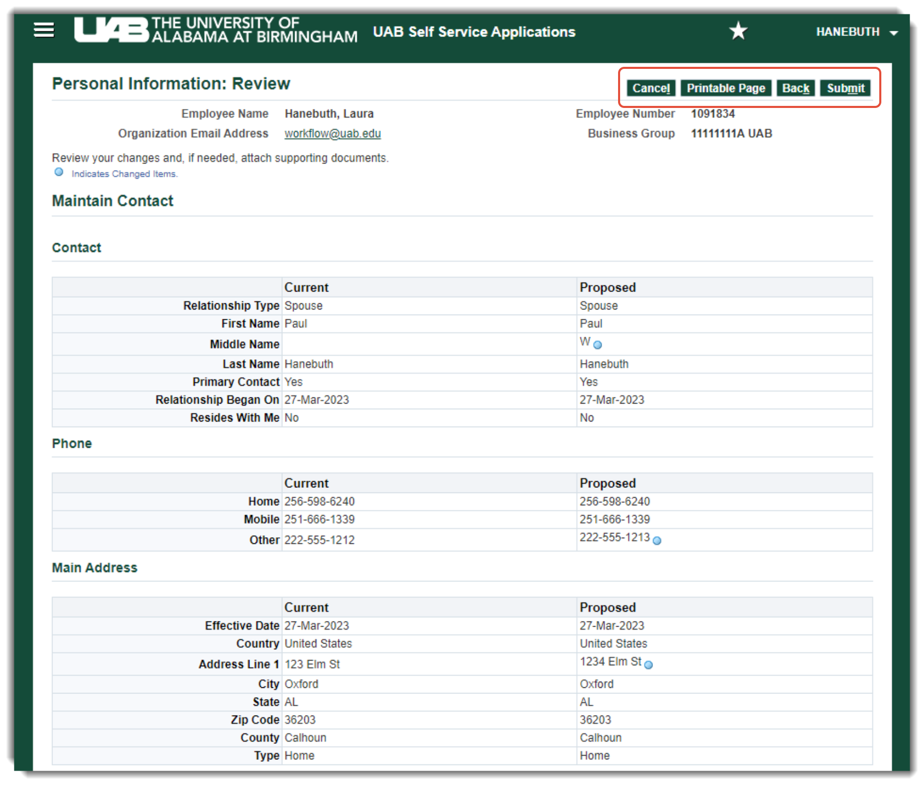 7. Review the information entered. Use the Back button to correct or add information, Cancel to discard, and Submit to confirm.