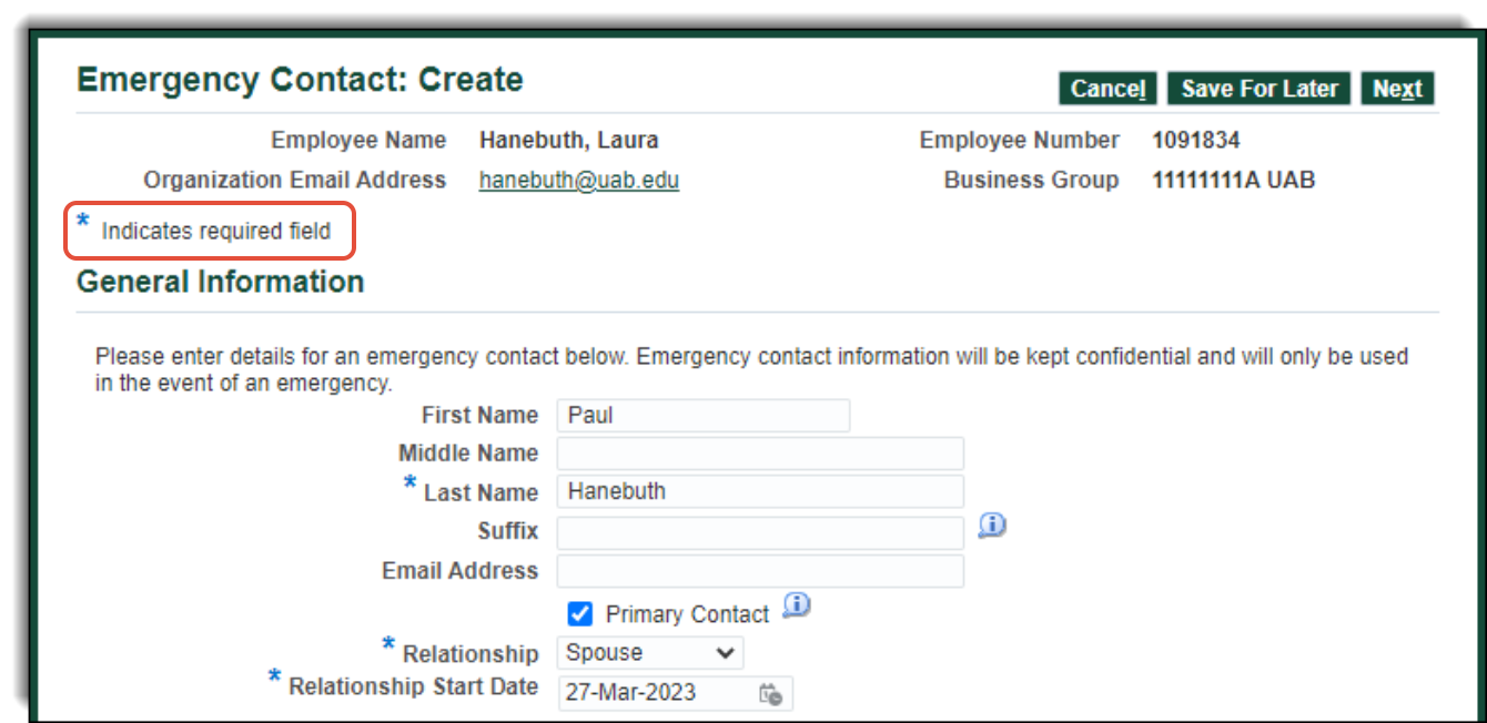 2. Enter all required (*) fields under General Information. The Relationship Start Date is the date the individual is added as an emergency contact.