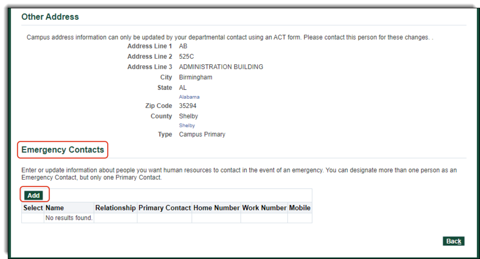 Emergency Contact information can be added to Oracle HR & Finance by employees using the UAB Self-Service application.