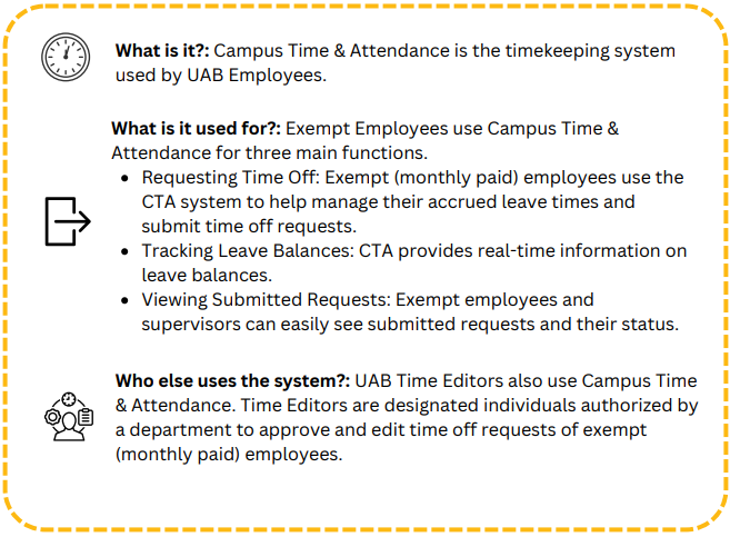 This content is designed for managers responsible for managing time-off requests for exempt or monthly paid employees in the Campus Time & Attendance application. By the end of this content, you will be able to: