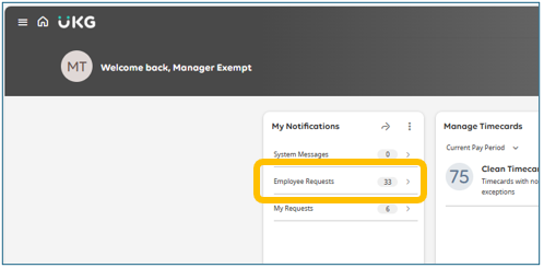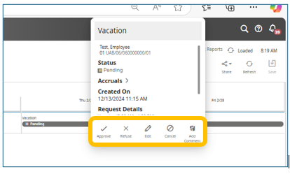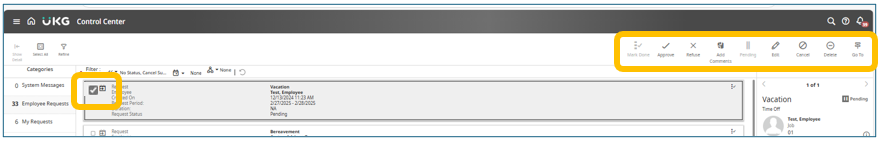 - The Control Center displays time off requests notifications that you have received. The default view shows requests that have a Submitted, Pending, or Cancel Submitted status. You can take action on a request from this page by selecting an employee and using the controls in the top right corner.