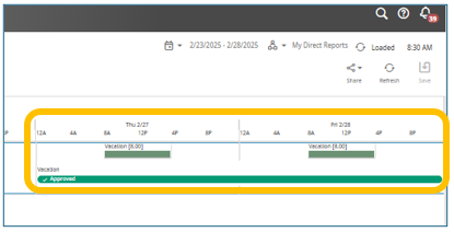 - The Control Center displays time off requests notifications that you have received. The default view shows requests that have a Submitted, Pending, or Cancel Submitted status. You can take action on a request from this page by selecting an employee and using the controls in the top right corner.